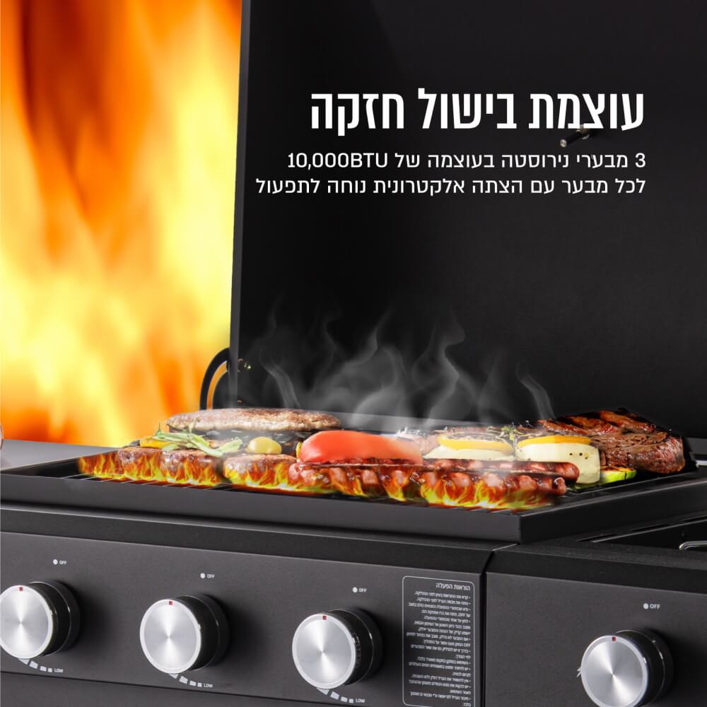 עוצמת בישול חזקה: 3 מבערי נירוסטה בעוצמה של 10,000BTU לכל מבער עם הצתה אלקטרונית נוחה לתפעול