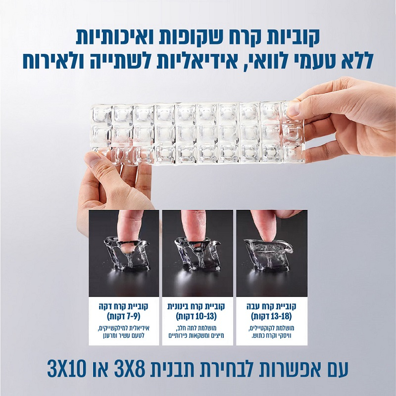 צורת הקרח: קוביות מרובעות שקופות, עם אפשרות לבחירת עובי הקרח