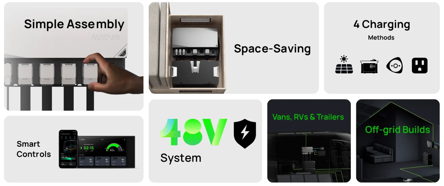 • חיסכון במקום: הבקר ההיברידי EcoFlow Power Hub משלב שני בקרי טעינה סולארית MPPT, מטען סוללה אחד עם MPPT, ממיר DC-DC מטה אחד ומטען AC. עם פחות רכיבים וכבלים דקים יותר, מערכת 48V זו חוסכת לך מקום וטרחה בהתקנה.