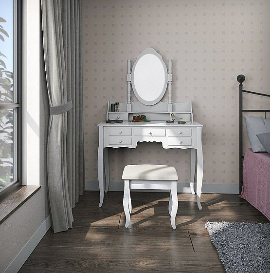 • השידה כוללת: 7 מגירות: 2 עליונות ו-5 תחתונות, מדף אחסון עליון, מראה וכסא תואם