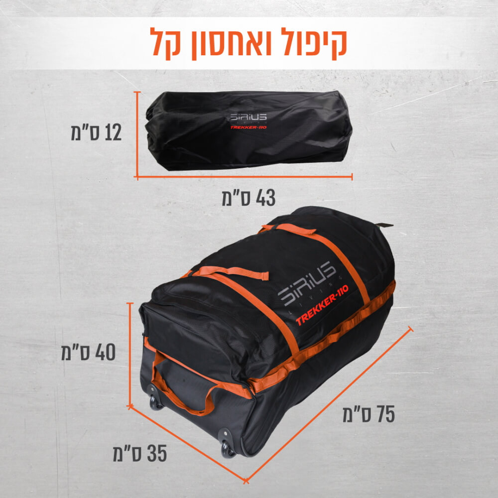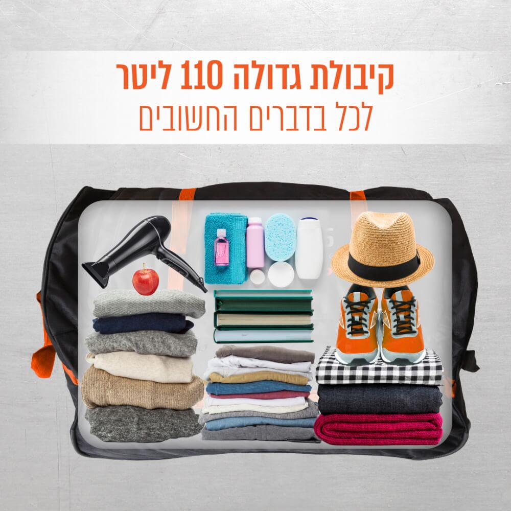 צ'ימידן ענק מתקפל: כשהוא פתוח, התיק במימדים 75X35X40 ס"מ ומכיל נפח של 110 ליטרים