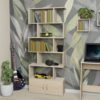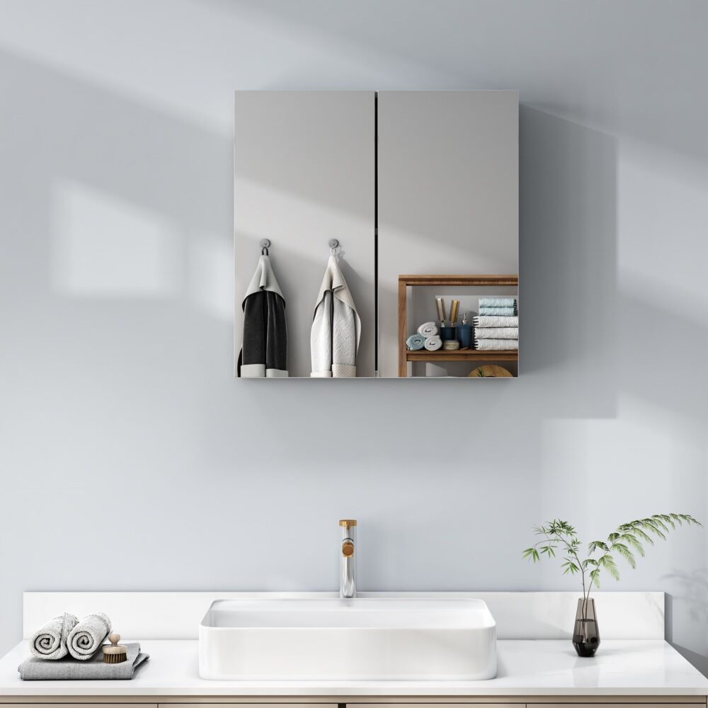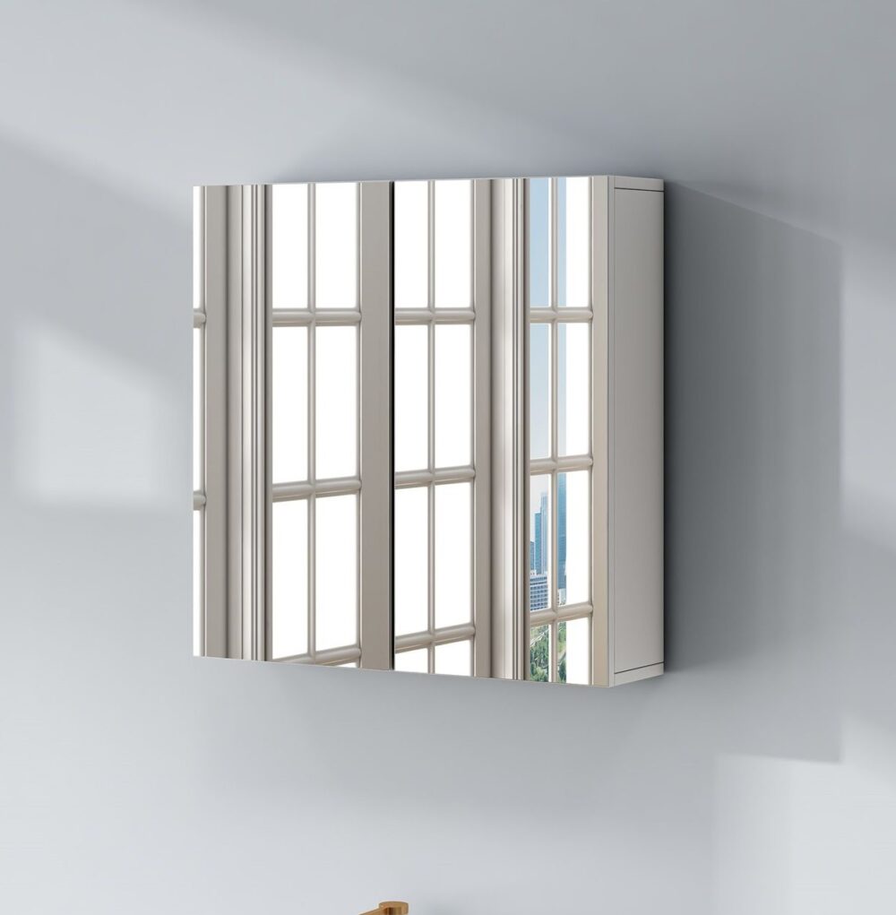 ארון אמבטיה לאחסון עם מראה, מתאים במיוחד לתלייה מעל הכיור. עשוי גוון עץ לבן עם חלוקה פנימית באמצעות מדף אמצעי.
