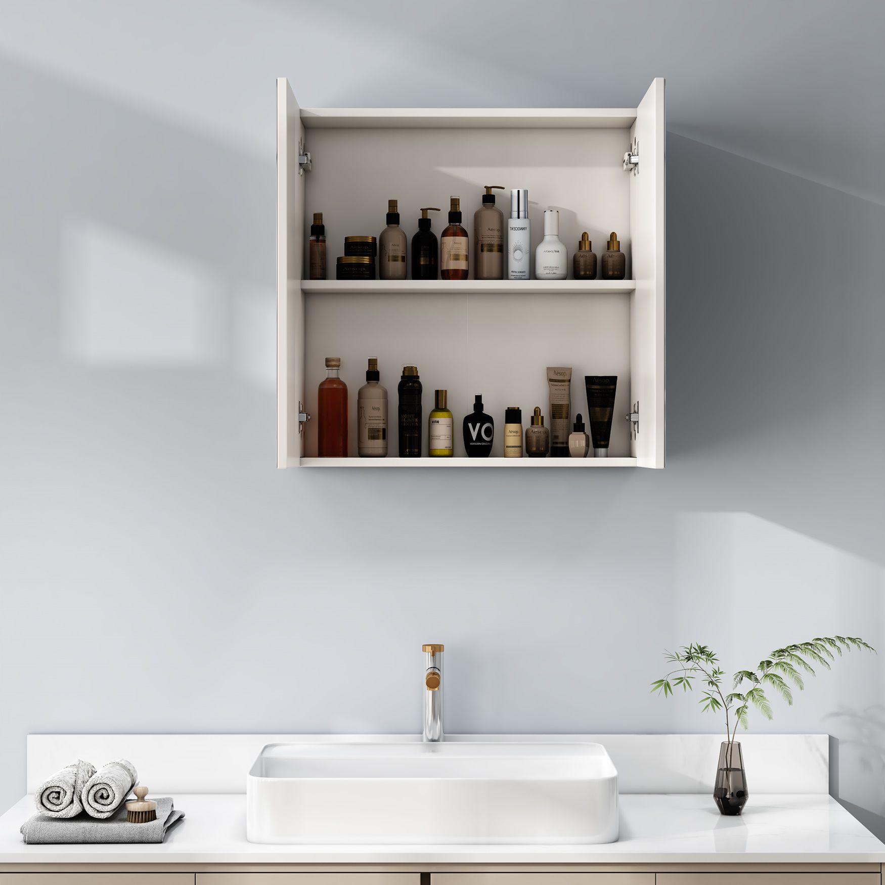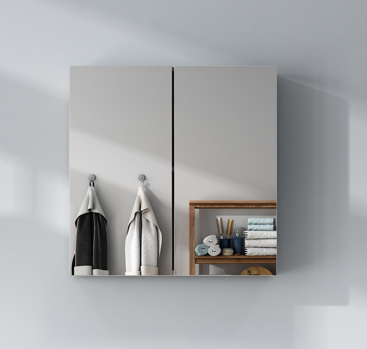 ארון אמבטיה לאחסון עם מראה, מתאים במיוחד לתלייה מעל הכיור. עשוי גוון עץ לבן עם חלוקה פנימית באמצעות מדף אמצעי.