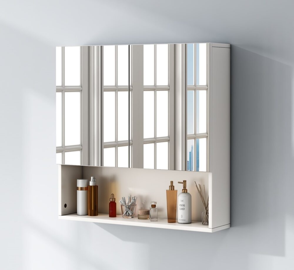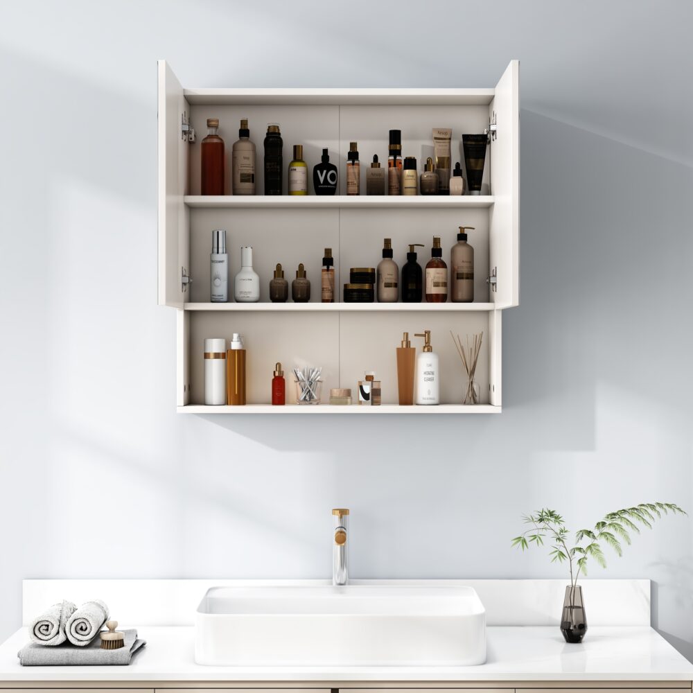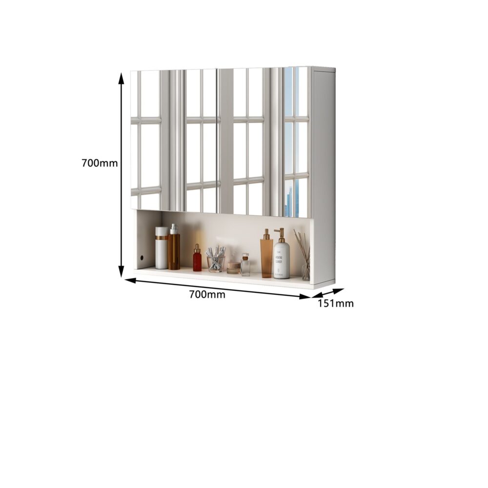 ארונית אמבטיה לתלייה על הקיר, בעלת מראה ואפשרות לאחסון עם מדף אמצעי ומדף תחתון פתוח. בצבע לבן, עם התקנה קלה ובטוחה. מידות: 70x70x15 ס"מ. ניתנת להרכבה עצמאית, נמכרת על ידי "אלקטריק סטייל".