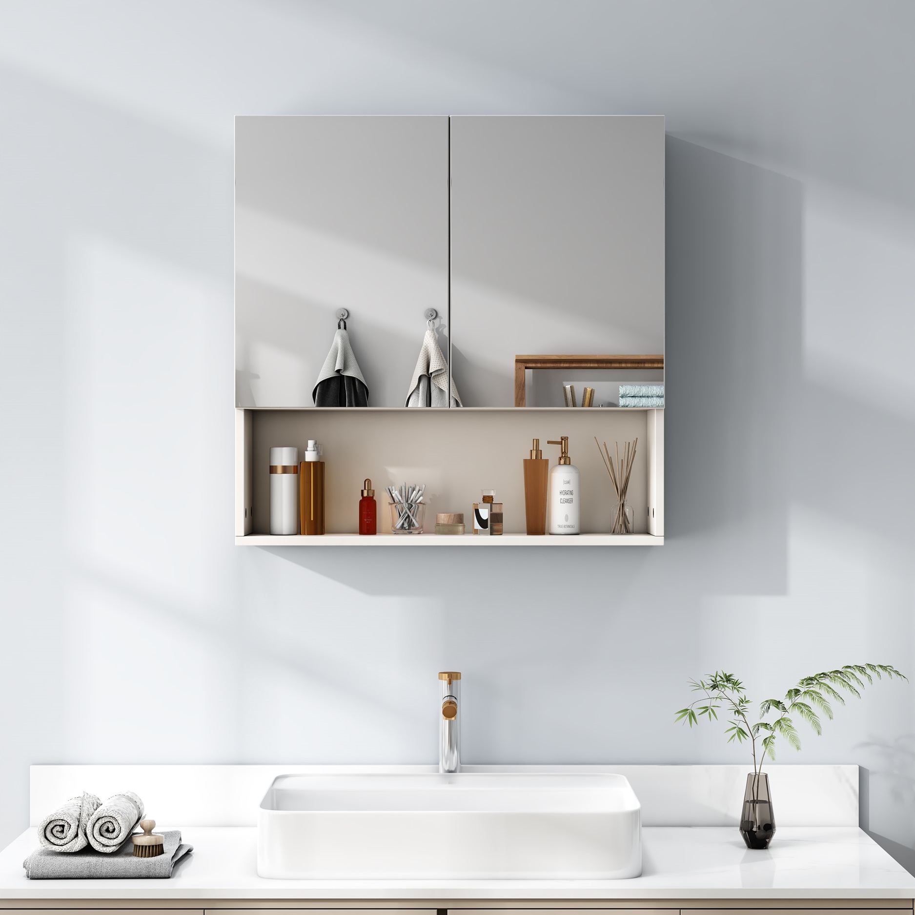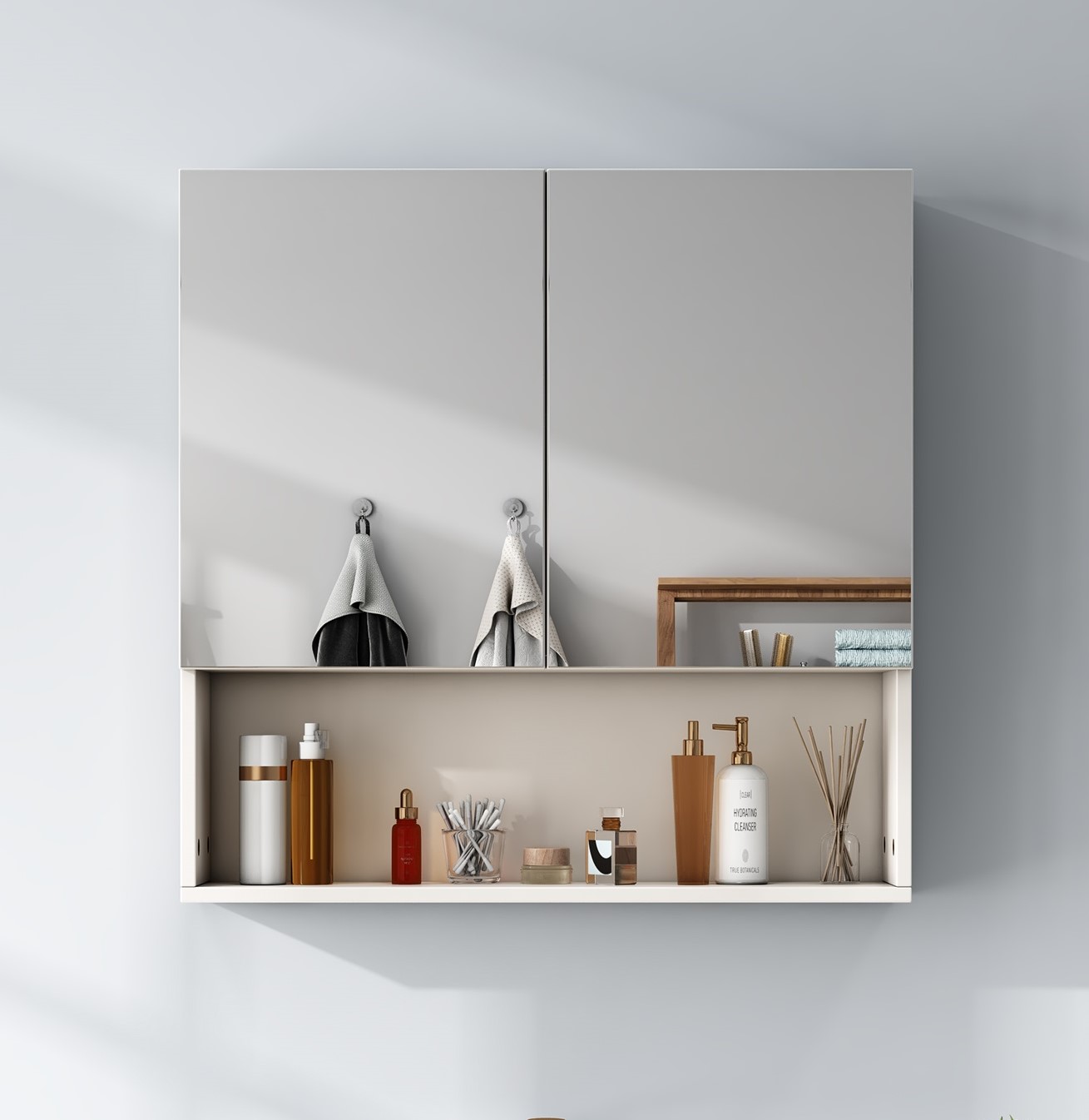 ארונית אמבטיה לתלייה על הקיר, בעלת מראה ואפשרות לאחסון עם מדף אמצעי ומדף תחתון פתוח. בצבע לבן, עם התקנה קלה ובטוחה. מידות: 70x70x15 ס"מ. ניתנת להרכבה עצמאית, נמכרת על ידי "אלקטריק סטייל".