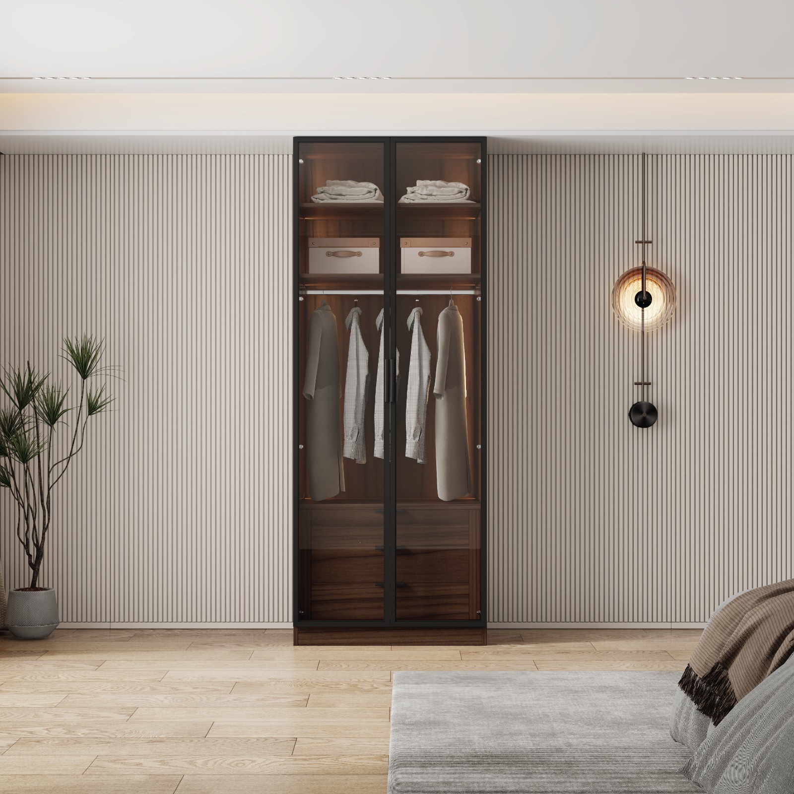 ארון בגדים 2 דלתות זכוכית עם תאורת LED דגם מילאנו מבית WOODY. עיצוב חדר השינה לרמה הבאה! דלתות זכוכית שקופות עם מסגרת אלומיניום ותאורת LED יוצרים מראה יוקרתי ומרשים.