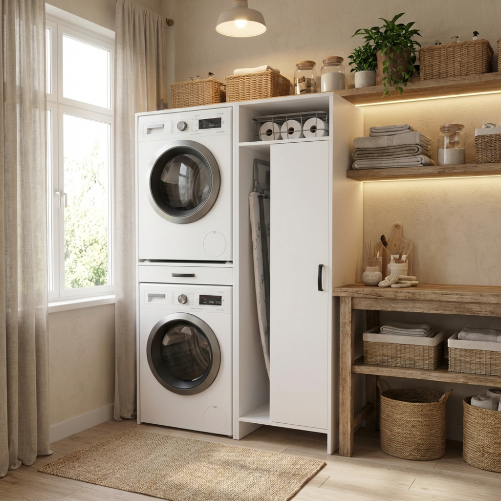 • חוסך מקום יקר – מכונת כביסה ומייבש בערימה, עם אחסון משני הצדדים