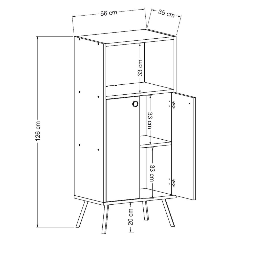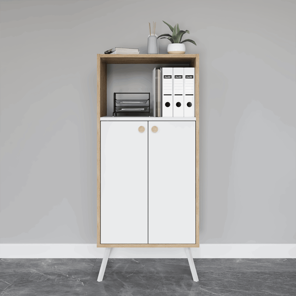 ארונית אחסון מודרנית ומהודרת מבית HOMAX בעיצוב מינימליסטי ונקי. הארונית משלבת צבעים עכשוויים עם חומרים איכותיים, כוללת שתי דלתות עם שני מדפי אחסון סגורים ומדף פתוח לכלים דקורטיביים או ציוד משרדי.