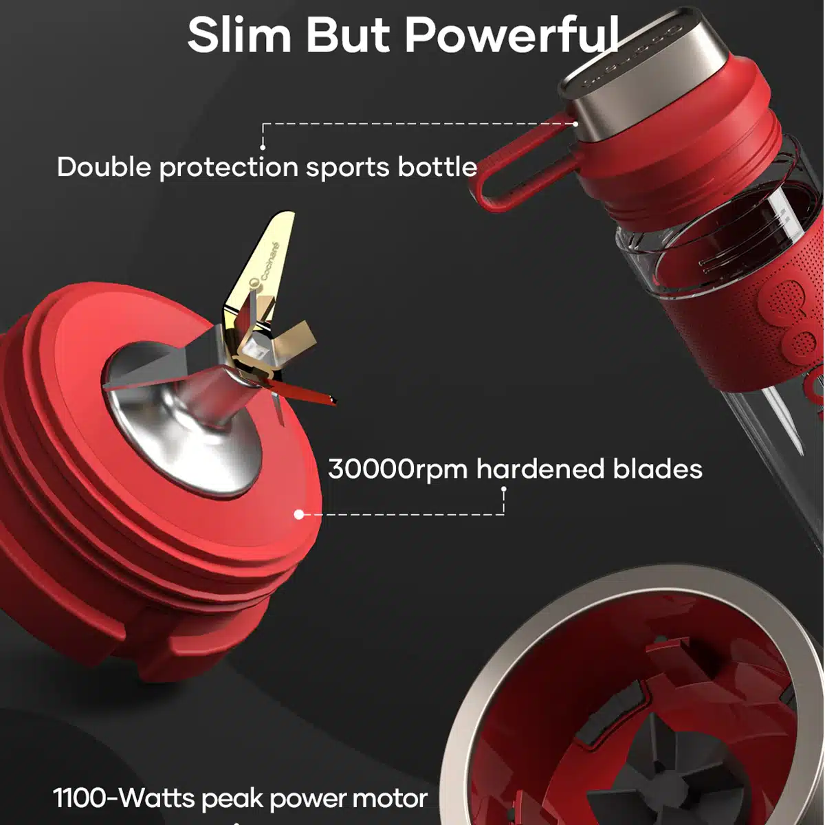 הבלנדר האישי של Cocinare מצויד במנוע עוצמתי עם הספק מקסימלי של 1100 וואט לטחינה מהירה ואפקטיבית של מרכיבים. המנוע כולל מערכת הגנה מפני חימום יתר. בעזרת שישה להבים מסגסוגת טיטניום, הבלנדר מוכן לאתגר של פירות קפואים, קרח ואגוזים תוך שניות.