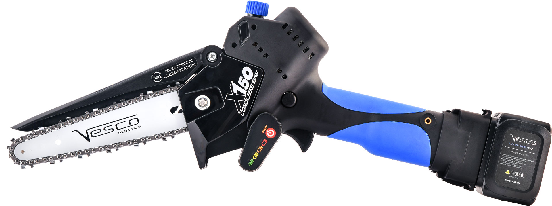 מסור השרשרת Vesco X150 משלב טכנולוגיה אלחוטית מתקדמת לנוחות מרבית. הסוללה הניתנת להחלפה מתחברת ישירות לידית, מה שמעניק חופש תנועה מוחלט ומשפר את יעילות העבודה. בזכות איזון המשקל המושלם, ניתן לבצע גיזום מדויק, מהיר וללא מאמץ גם לאורך זמן.