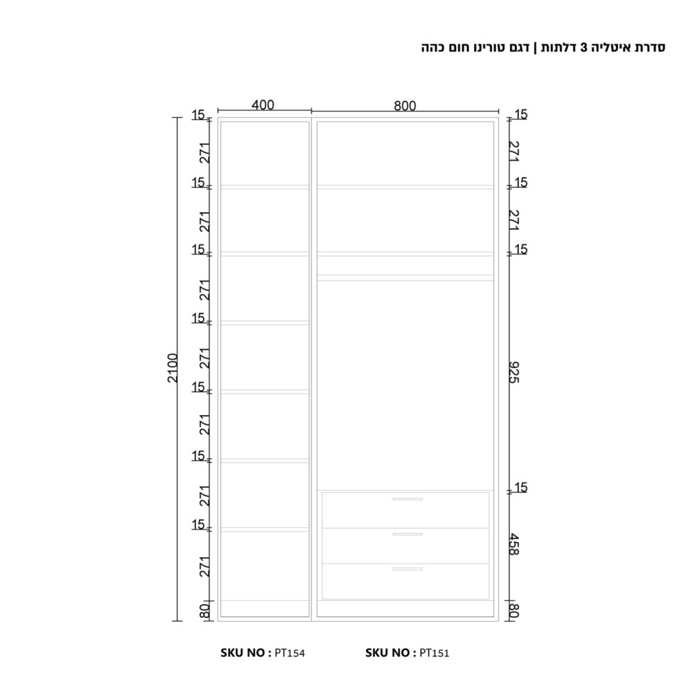 ארון בגדים 3 דלתות זכוכית עם תאורת LED – סדרת איטליה דגם טורינו