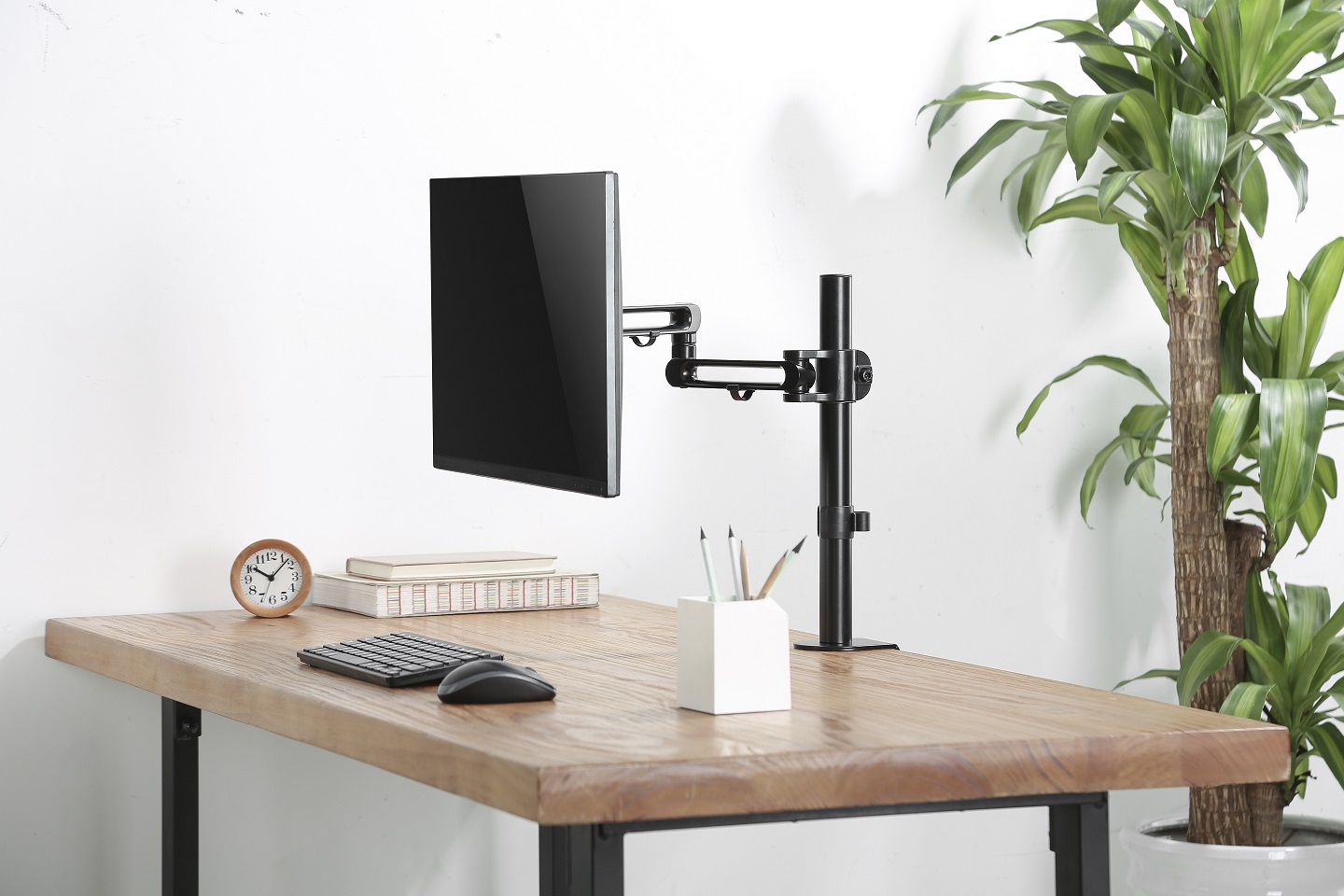 זרוע אלומיניום מסוגננת למשרד או לבית, מספקת התאמה גמישה של זווית וגובה המסך לחוויית צפייה מושלמת. קלה להתקנה עם קיבולת עד 8 ק"ג ותאימות למפתחות ברגים 75X75, 100X100.
