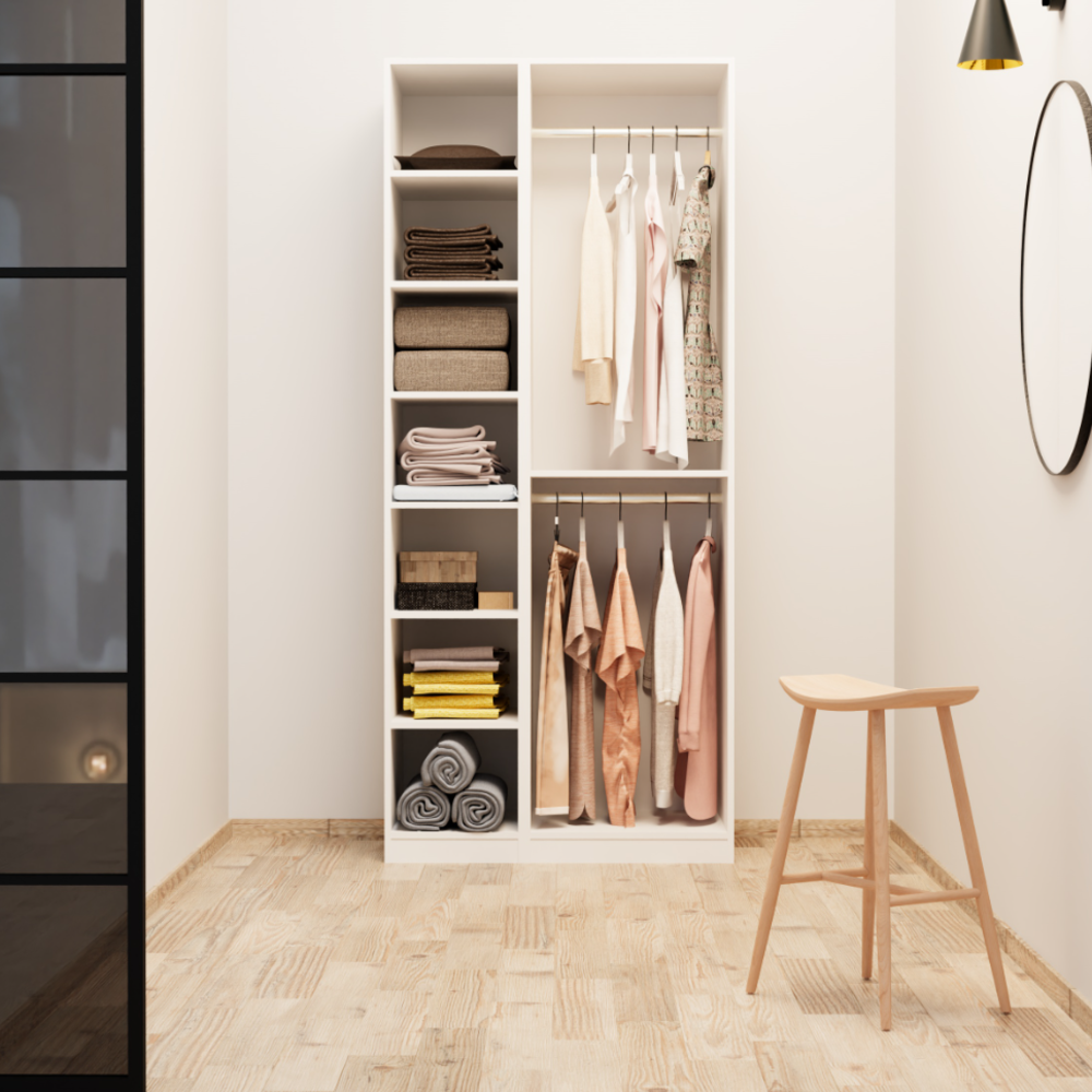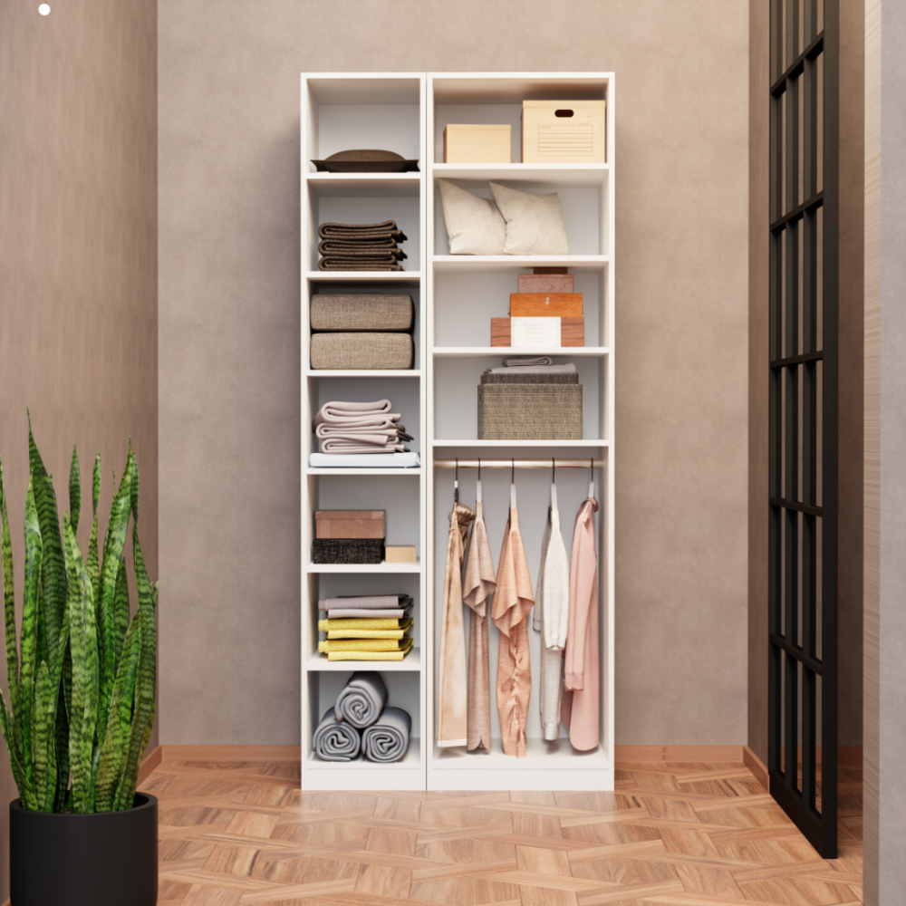 המדפים מתאימים לאחסון בגדים מקופלים, מגבות, קופסאות ואביזרים שונים, בעוד אזורי התלייה מאפשרים תליית בגדים ארוכים וקצרים. חלוקה חכמה שמייעלת את הסדר והנגישות.