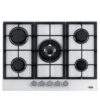 הכיריים מציעים עיצוב שטוח עם חמישה ראשי גז מובנים כולל להבת טורבו להצתה אלקטרונית ותחושת בטיחות עם חיישני מניעת דליפת גז. המשטח עשוי נירוסטה מוברשת ורשתות יצוקות. המפרט מציג עוצמות מבער רבות המשתנות בין קטן לגדול, כולל טבעת כפולה טורבו.