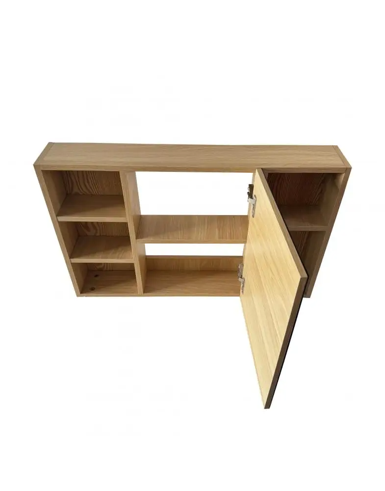 המראה המשובצת בדלת הופכת את הארון לרב-תכליתית: מחד, מדפים מרווחים לאחסון שמפו, קרמים ואביזרים, ומאידך – מראה מלאה שתחסוך לכם מקום על הקיר.