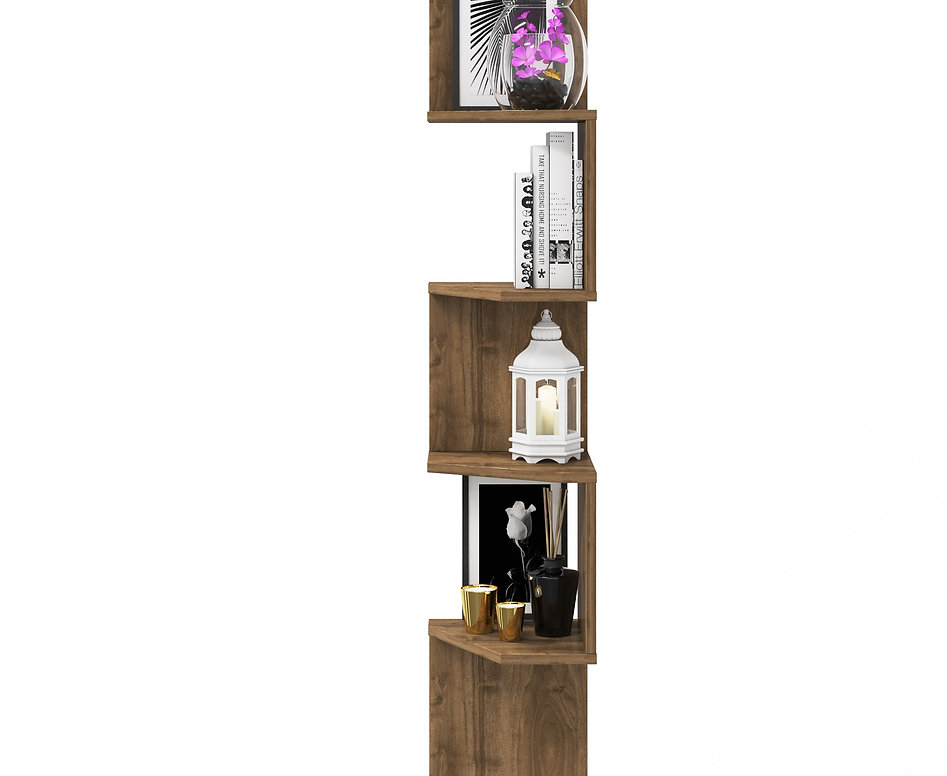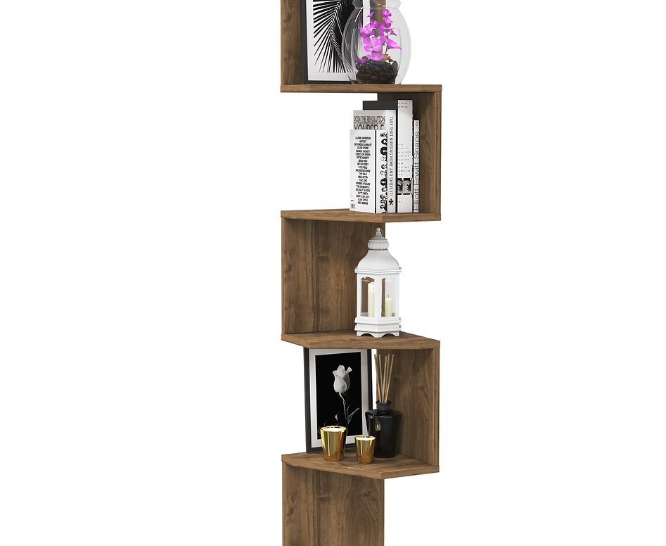 - יחידת מדפים אסימטרית בעיצוב מודרני בצבע אגוז.