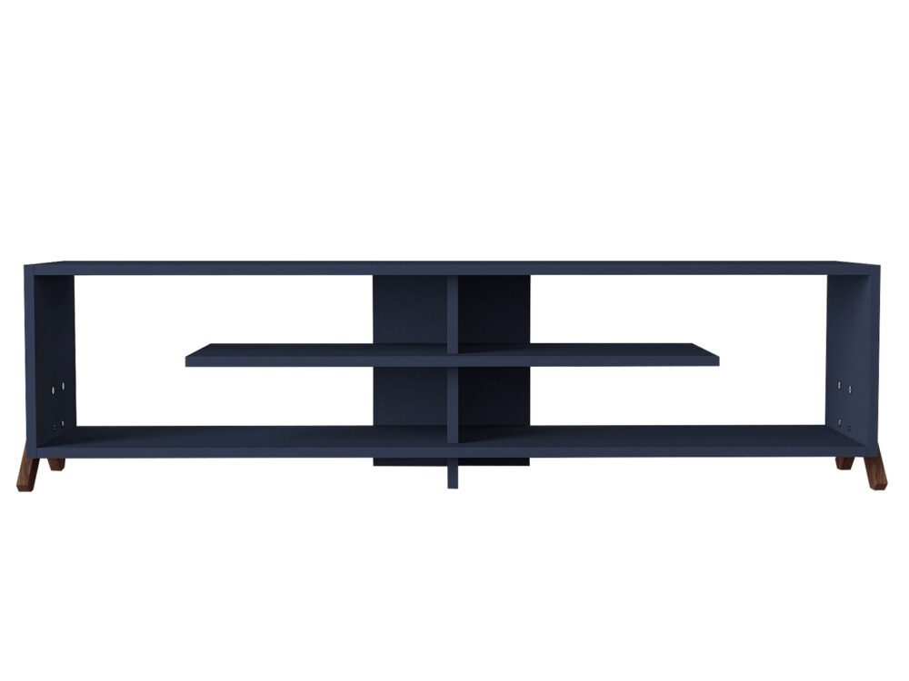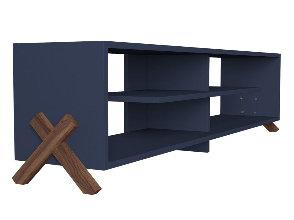 מזנון טלוויזיה מבית HOMAX בעיצוב מרשים בצבע כחול כהה עם רגליים בצבע אגוז. מתאים לטלוויזיה ולנוי, ומציע מקום אחסון רב ונגיש.