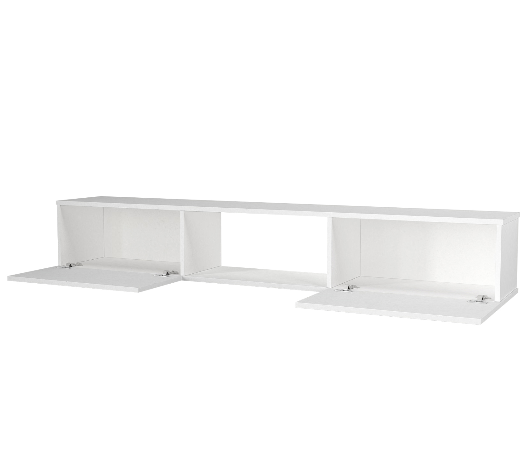 מזנון טלוויזיה צף עם עיצוב מודרני במבחר צבעים נייטרלים. המזנון כולל שני תאי אחסון גדולים עם קלאפה ותא אחסון פתוח ביניהם.
