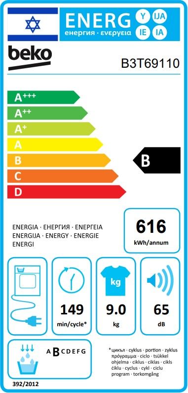 מייבש כביסה Beko עם קיבולת 9 ק"ג ודגם B3T69110 – חווית ייבוש מושלמת!