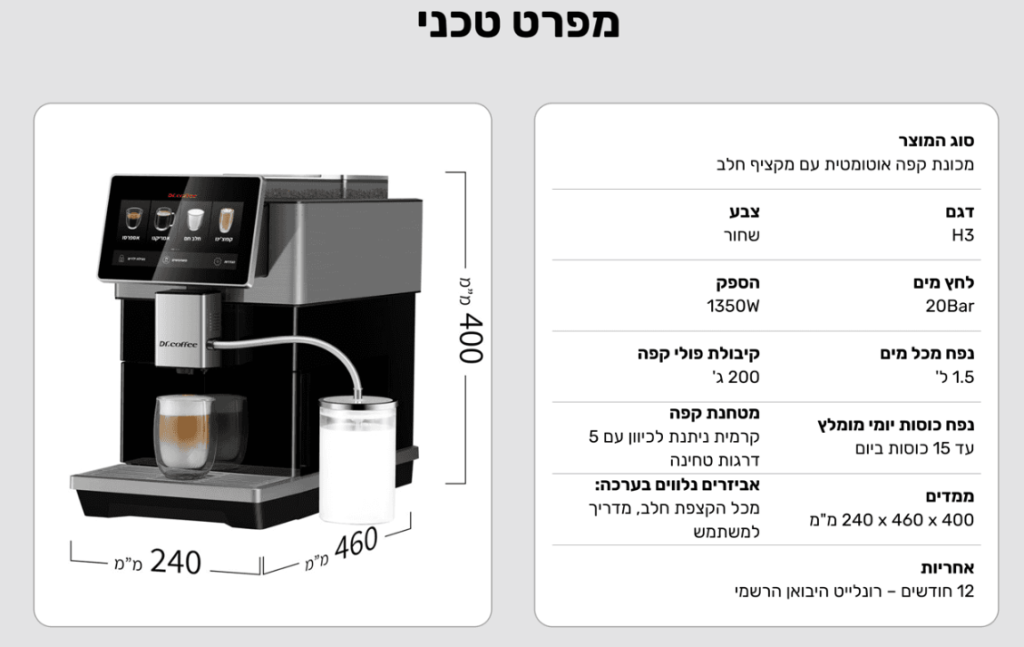 מכונת קפה אוטומטית דגם H3 מבית Dr.Coffee – בעלת מסך מגע בעברית, מקציף חלב, מטחנה קרמית מתקדמת ומגוון אפשרויות התאמה אישית להכנת קפה איכותי בלחיצת כפתור בבית.