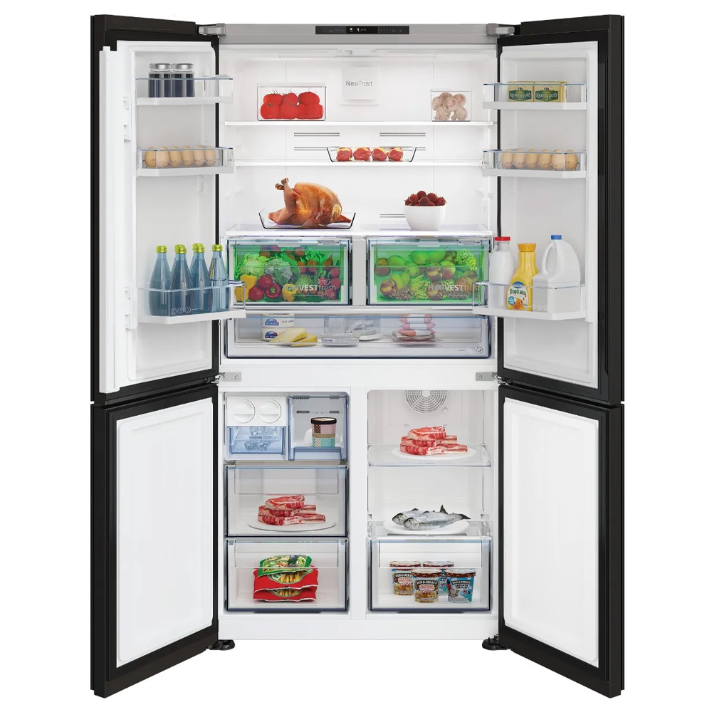מקרר BEKO GN1406223GB בעל נפח 572 ליטר, מערכת קירור NeoFrost Triple Cooling, מדחס ProSmart Inverter, מנגנון שבת, ומגירות HarvestFresh עם תאורת LED לשמירה על טריות מזון. שנה אחריות.