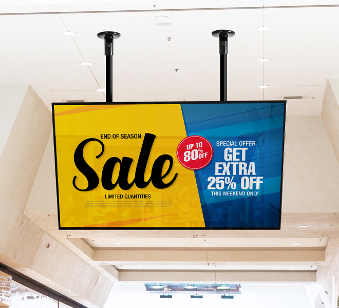- מתקן מותאם למסכים עד 80 ק"ג עם מערכת מוטות System-2 להתקנה מהתקרה