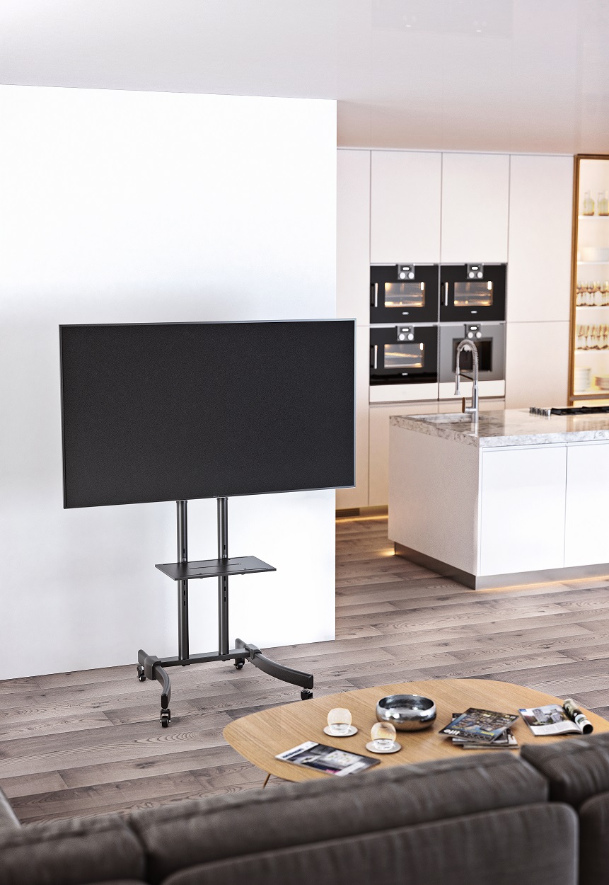 עגלת נשיאה למסכים עד 75 אינץ' עם מדף לממיר והטיית מסך. מושלמת למסעדות, חדרי ישיבות, אירועים, ומקומות ציבוריים. פתרון נוח ויעיל גם לבית ולחצר.