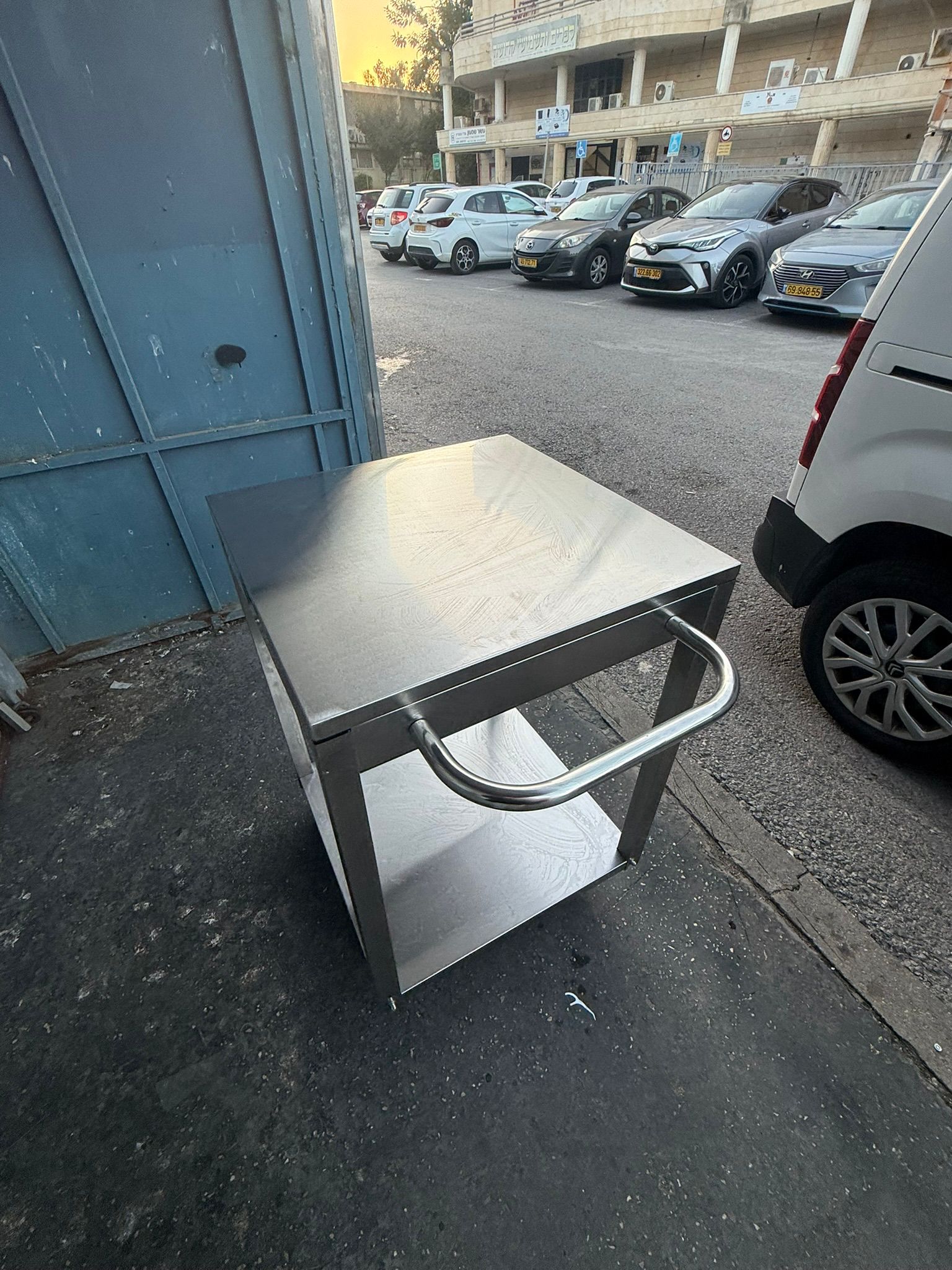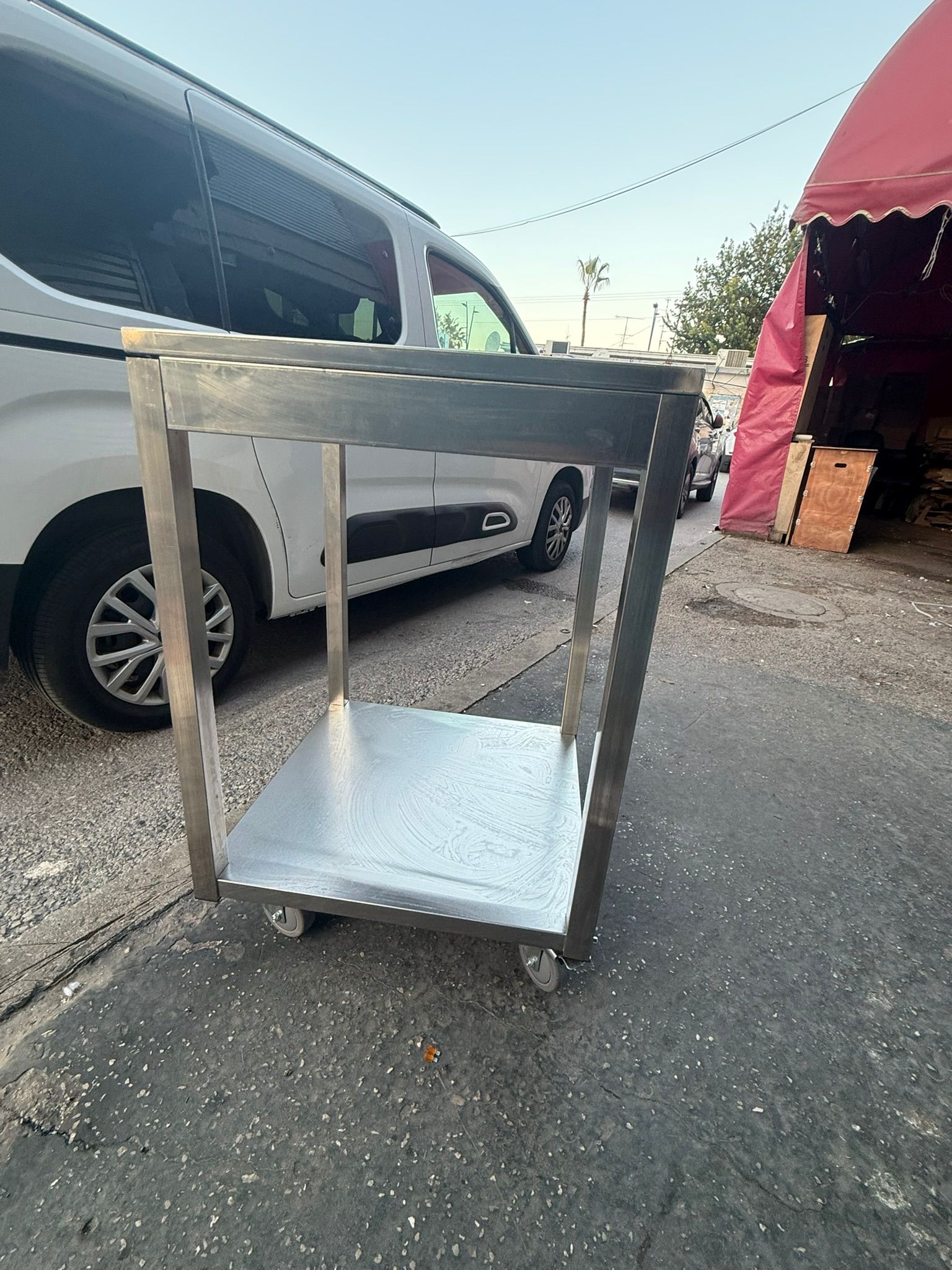 עגלת נירוסטה עם גלגלים במידות 60/60 ס"מ גובה 90 ס"מ בעל ידית דחיפה ומדף תחתון