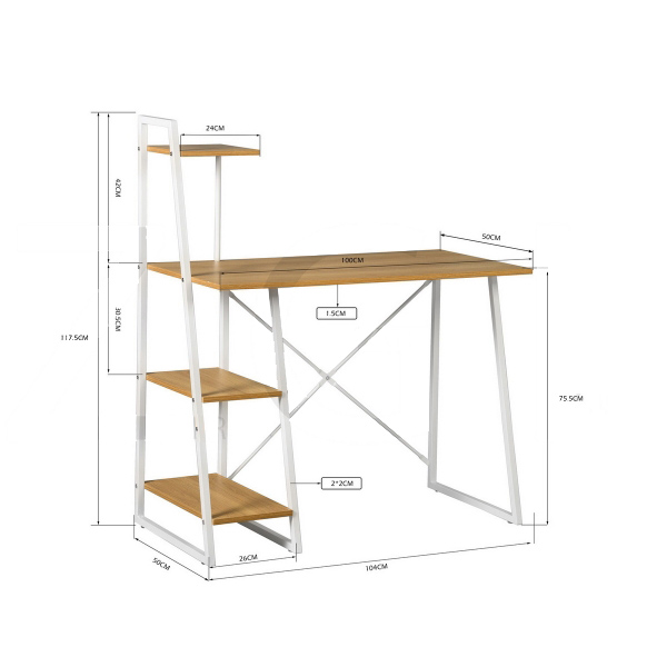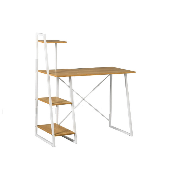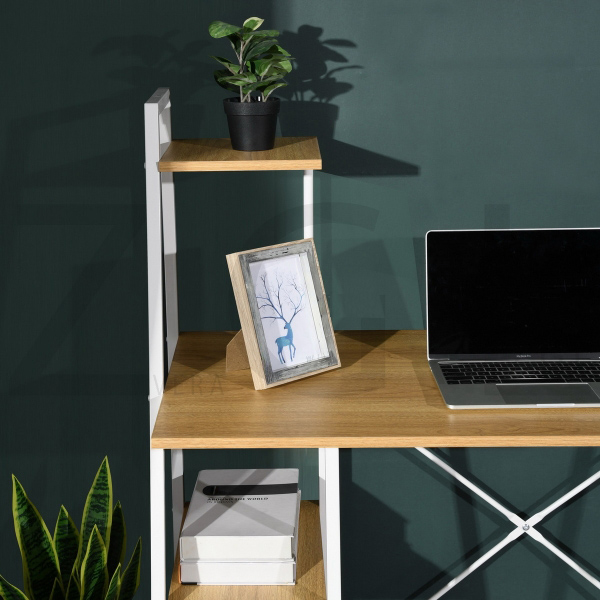 עמדת העבודה כוללת פלטת שולחן רחבה, מדף עליון ושני מדפים תחתונים להגדלת אפשרויות האחסון.