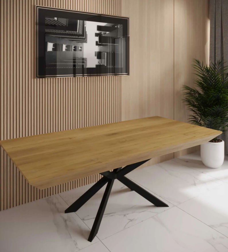 השולחן משולב מעץ  פורניר אלון  , השולחן מצופה בשכבה עמידה לחום ומונעת שריטות , רגלי מתכת יצוק מצטלבות וחזקות העמידות לאורך שנים.