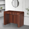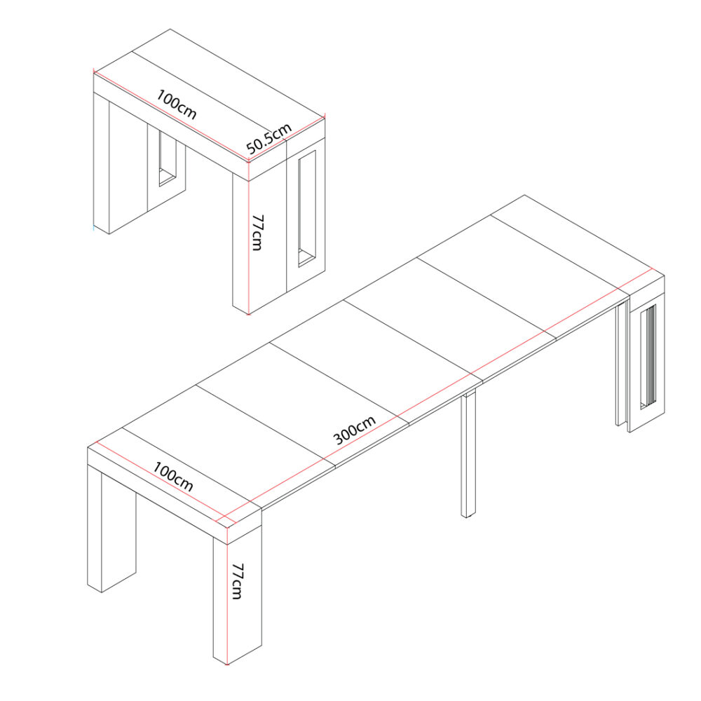 קונסולה נפתחת מעוצבת, אידיאלית לאירוח בחללים קטנים. הקונסולה יכולה לעבור ממצב קומפקטי למצב שולחן אוכל מרווח באורך 3 מטרים, שמתאים ל-12-14 סועדים.