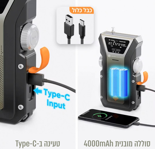 המוצר המושלם למצבי חירום ולטיולים בטבע רדיו FM/AM נייד המשלב פנס חזק, טעינה סולארית וידנית, וסוללה נטענת עוצמתית בנפח 4000mAh מיועד לכל מי שרוצה להיות מוכן למצבים בלתי צפויים וליהנות ממכשיר עמיד, נוח וקל לשימוש 3 גלי רדיו FM/AM/WB: גישה למגוון תחנות רדיו בכל זמן ומקום, עם קליטה איכותית 3 גלי רדיו FM/AM/WB: גישה למגוון תחנות רדיו בכל זמן ומקום, עם קליטה איכותית