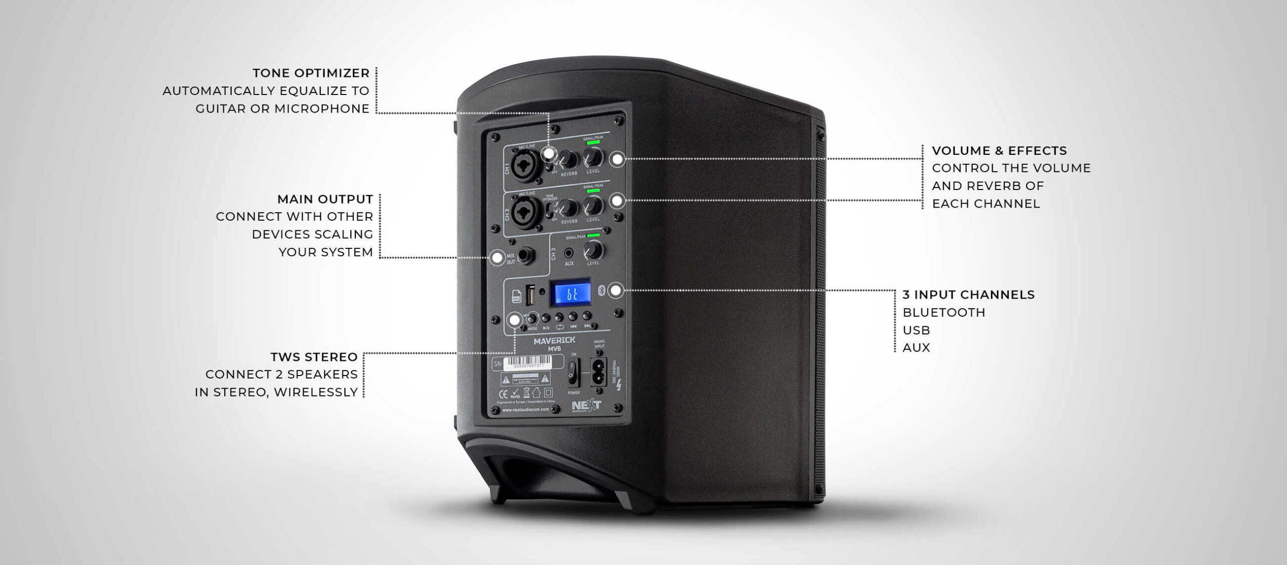 - כניסת מיקרופון וסוללת Lithium-Ion למגוון שימושים במיוחד לבמה ולבית