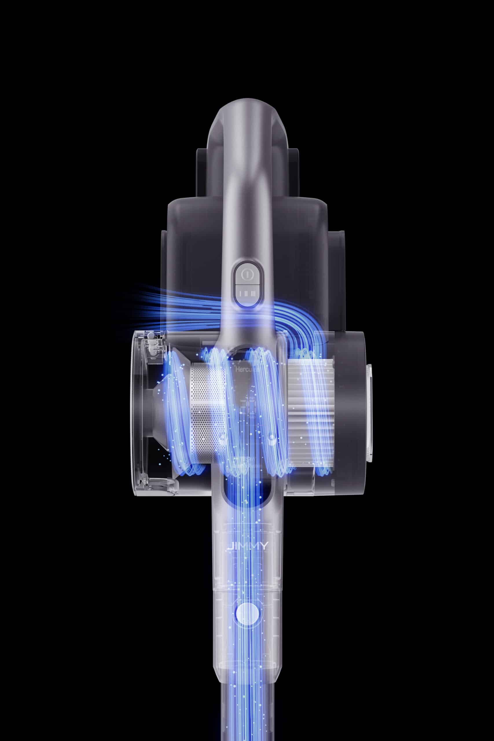 עיצוב הציקלון האופקי העדכני ומוגן הפטנט של JIMMY מפחית חסימות בנתיבי האוויר במיכל האבק, העשויים לגרום לאובדן עוצמת יניקה. טכנולוגיית הציקלון הכפול מפרידה ביעילות את האבק מהאוויר, ומפחיתה אובדן עוצמת יניקה. בהשוואה לריבוי ציקלונים, הציקלון הכפול של JIMMY יוצר פחות התנגדות אוויר והופך את השאיבה לעוצמתית יותר. השואב מסוגל ללכוד חלקיקים גדולים ועד 99.99% של אבק דק תוך הימנעות מפיזור חלקיקי אבק אל מחוץ לשואב.