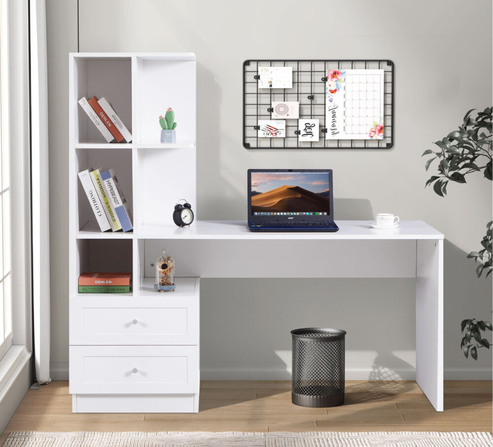 שולחן מחשב לבן דקורטיבי המשמש גם כספריה עם מדפים לאחסון ספרים וחומרי לימוד. מתאים למשרד, חדרי ילדים וסטודנטים בעיצוב מודרני. מידות: גובה 102 ס"מ, רוחב 113 ס"מ, עומק 50 ס"מ. זמן אספקה: עד 10 ימי עסקים.