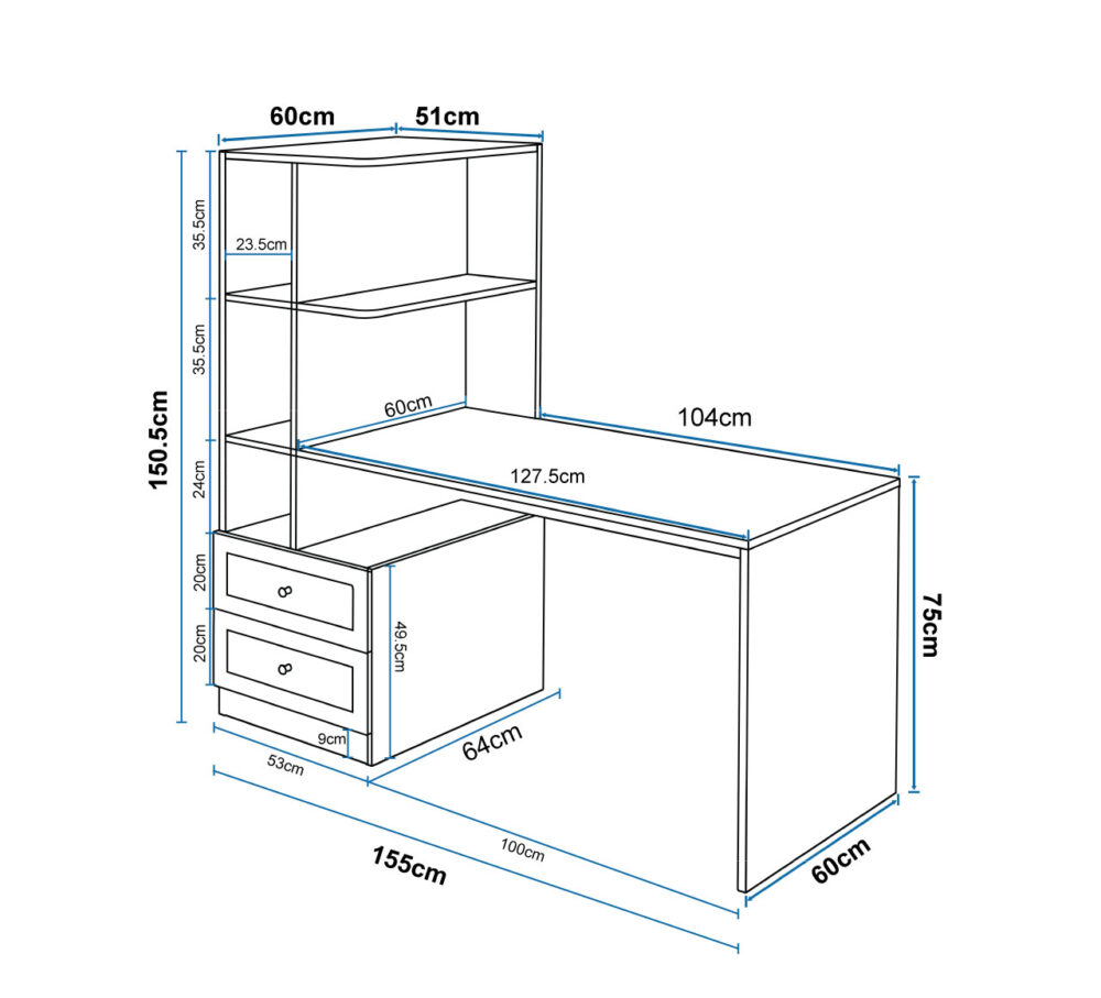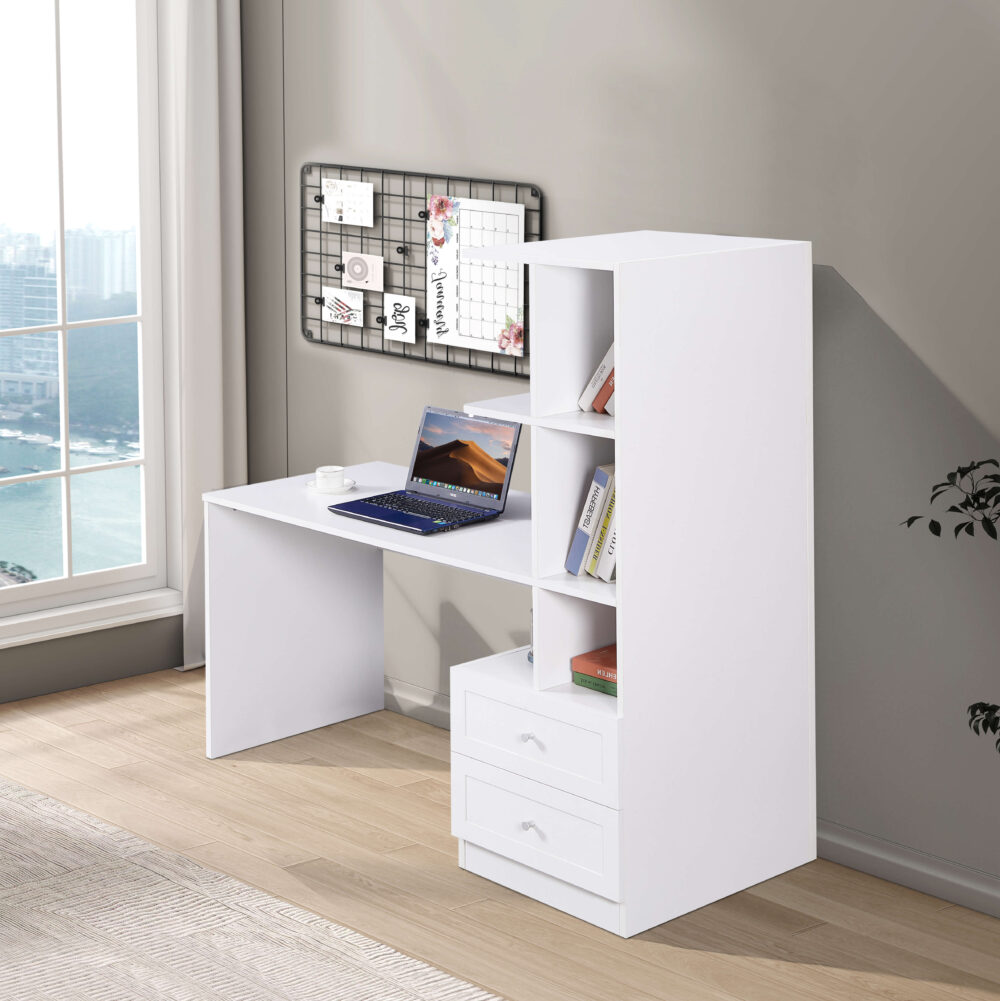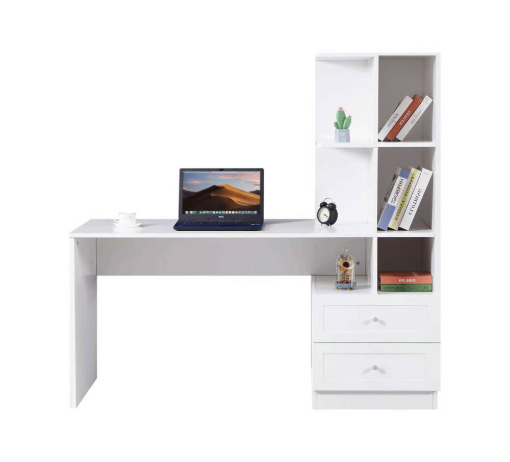שולחן עבודה פונקציונלי בעיצוב אלגנטי ונקי, אידיאלי למשרד ביתי או לחדר ילדים. כולל משטח עבודה רחב ונוח משולב בספרייה עם 6 תאי אחסון פתוחים ושתי מגירות מרווחות. דגם חדש ומשודרג עם תכונות בטיחות ונוחות משופרות.