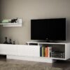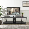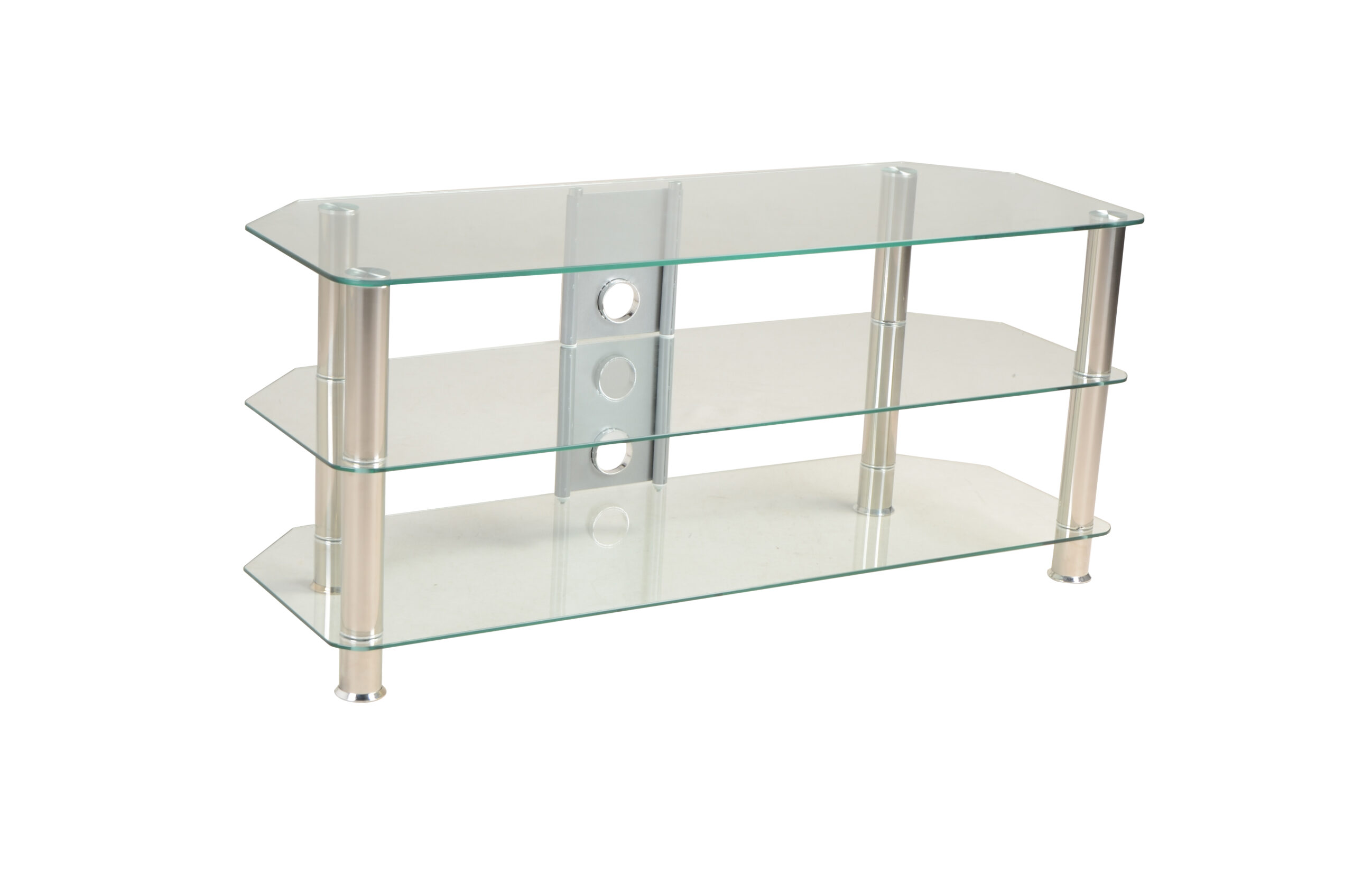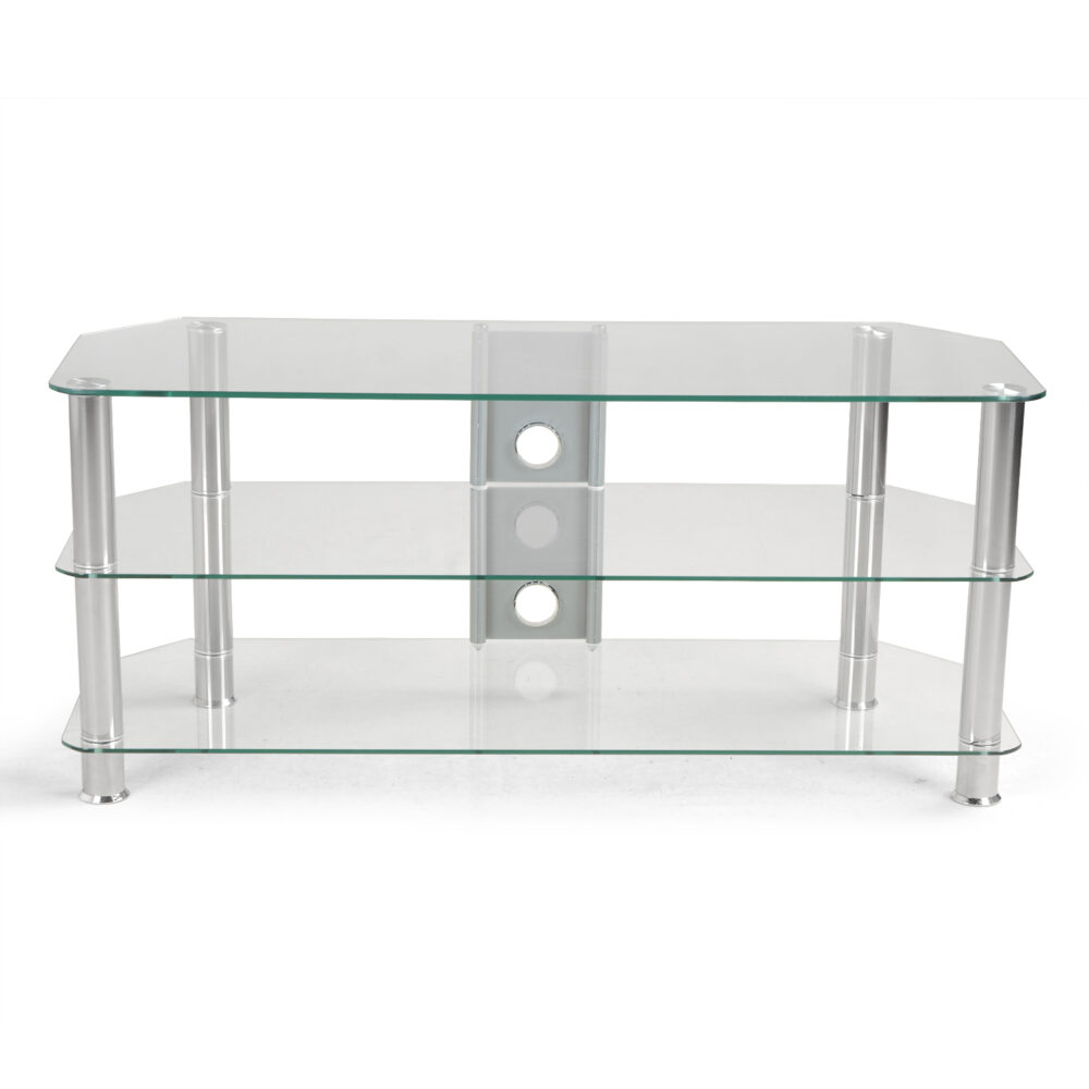 שידת טלוויזיה יפיפייה עשויה מזכוכית שקופה, עם שלושה מדפים המשלבת עיצוב קלאסי ומתאים לכל חדר בבית.