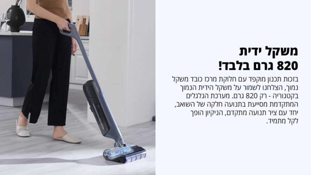 • קל משקל במיוחד – משקל ידית של 820 גרם בלבד, מה שהופך את הניקיון לקל ונוח במיוחד.