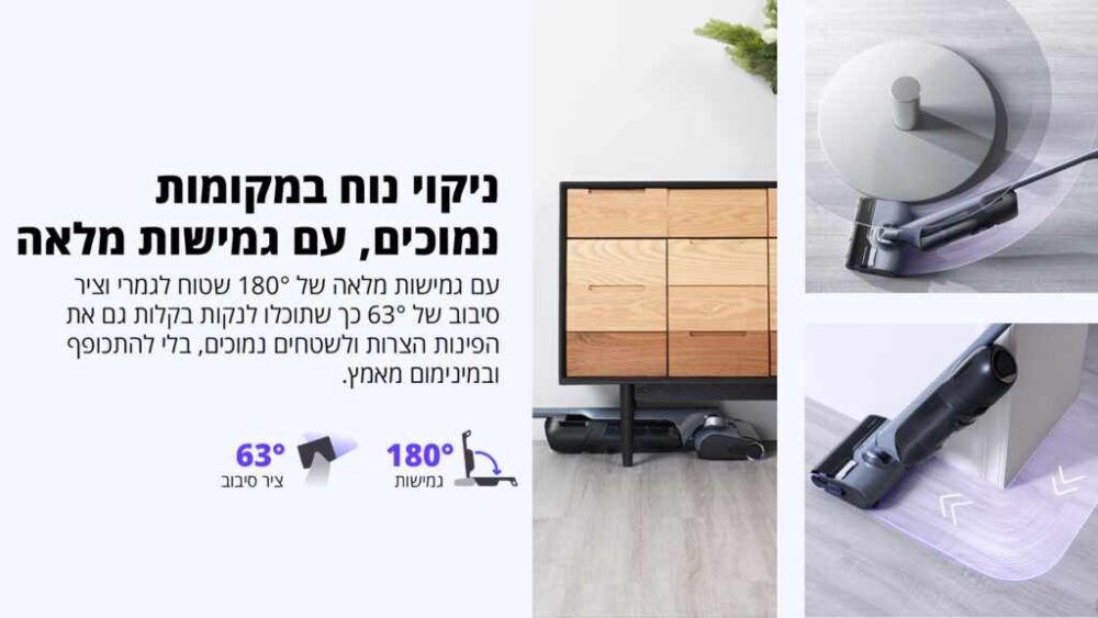 • גמישות מלאה ונוחות תנועה – עם גמישות של 180 מעלות וציר סיבוב של 63 מעלות , הוא מגיע לכל פינה ומתחת לרהיטים בקלות.
