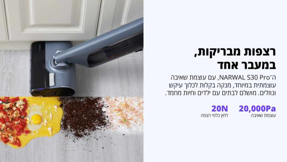 ה־NARWAL S30 Pro הוא שואב ושוטף אלחוטי חדשני המשלב עוצמה של 20,000Pa,