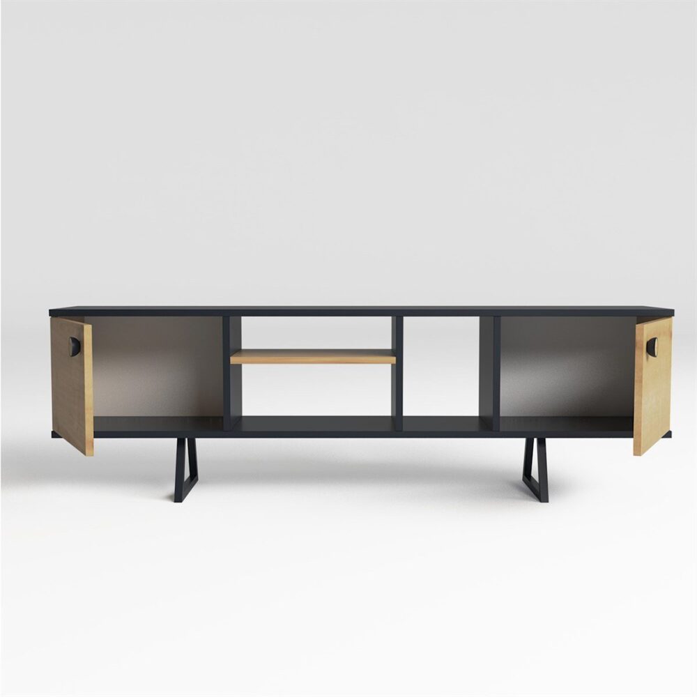 עיצוב: מזנון טלוויזיה מעוצב בעיצוב מודרני עם קווים נקיים, שמשלב עץ איכותי ומתכת עמידה למראה יוקרתי ומינימליסטי.